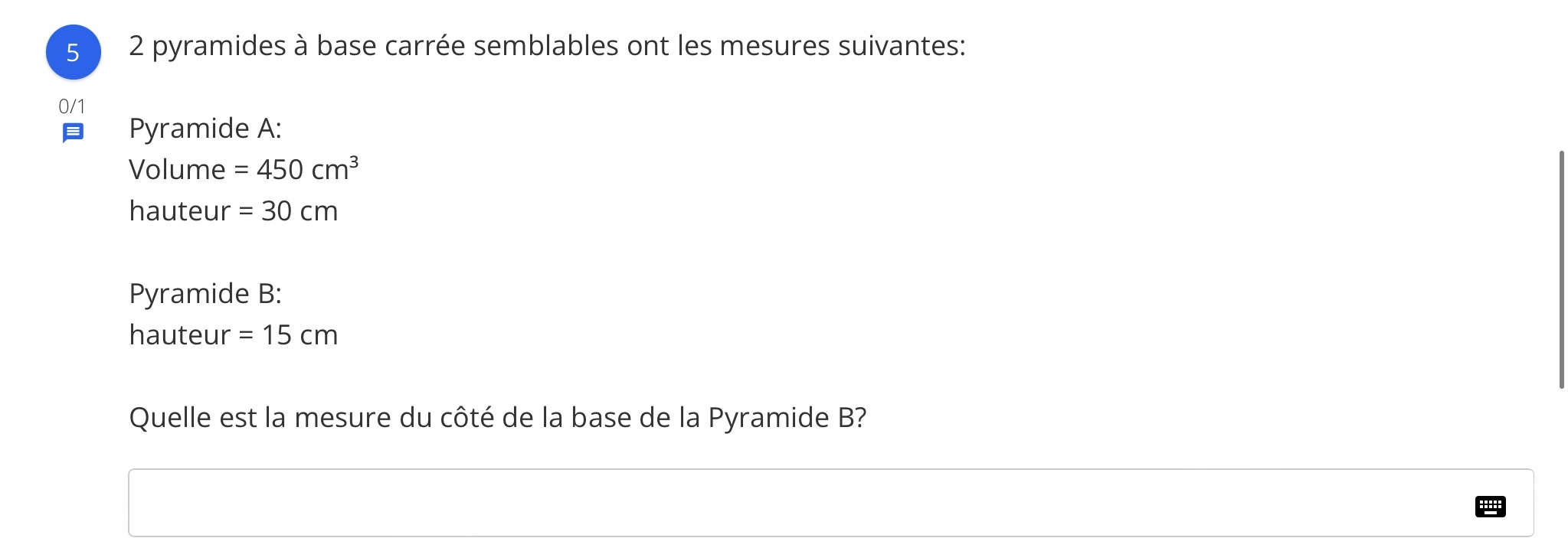 On peut donc établir un rapport de similitude k à l'aide des deux hauteurs connues. Puis, on pourra déterminer le rapport des volumes k³, en affectant simplement un exposant 3 au rapport de similitude trouvé. Une fois le rapport des volumes trouvé, on sera alors en mesure de déterminer le volume de la pyramide B. À l'aide de ce volume et de la formule de volume d'une pyramide, soit :