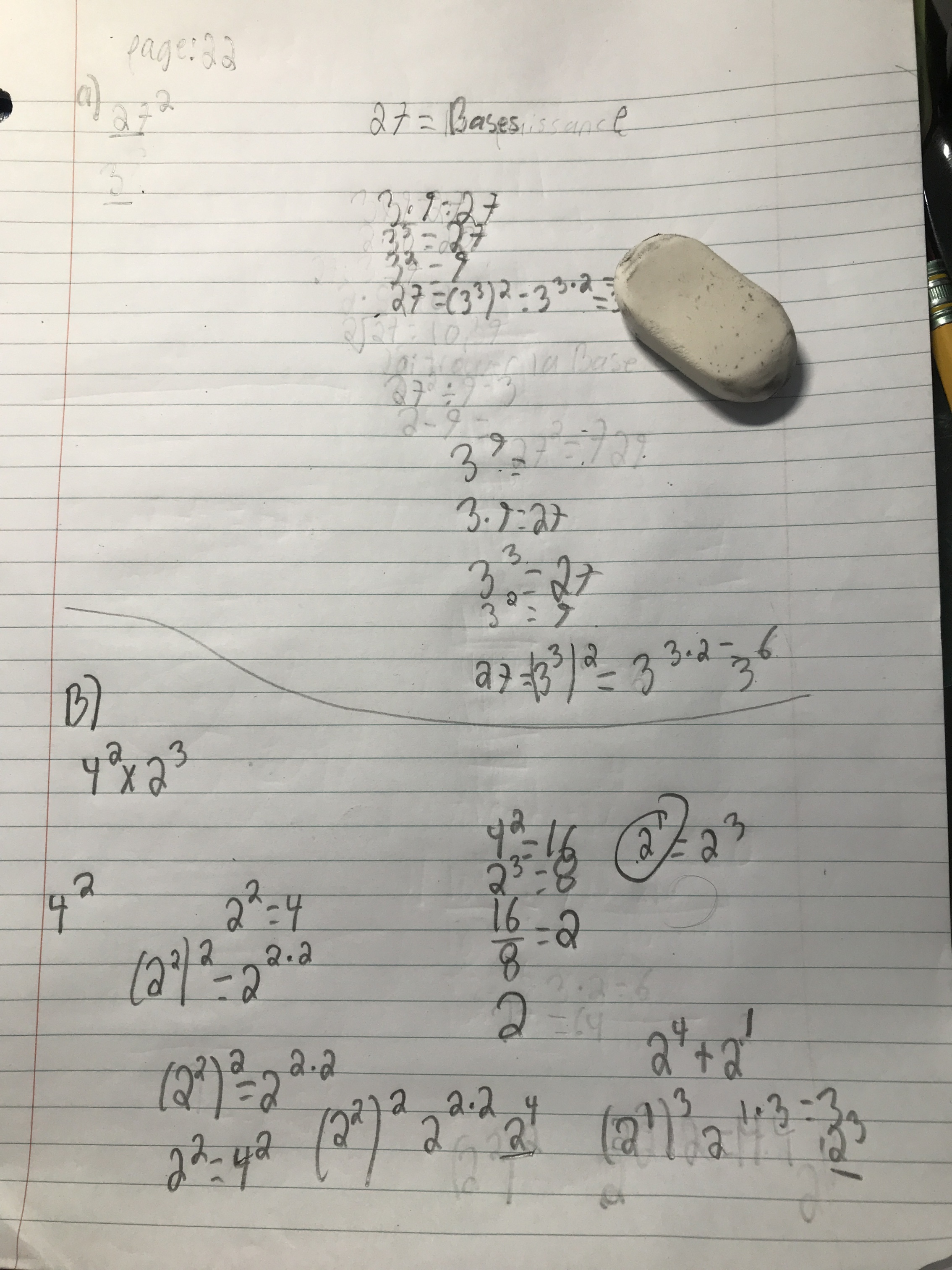 \begin{align*}\textcolor{Blue}{4^{2}} \times 2^{3}&= \textcolor{Blue}{2^{4}}\times 2^{3} \\ \\ &= 2^{4+3} \\ \\ &=2^{?}\end{align*}