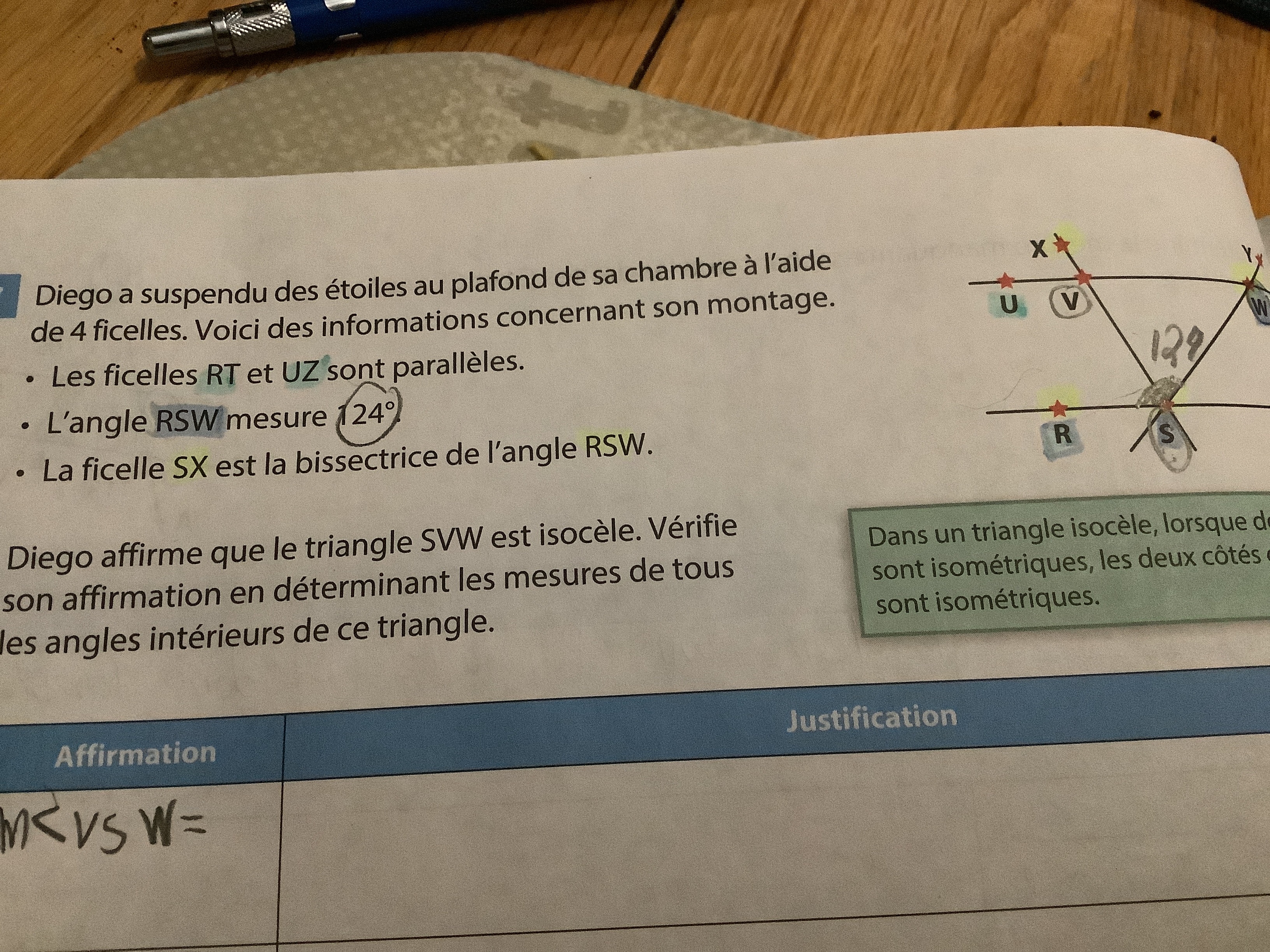 Tu sais que un triangle isocèle à 2 angles égaux (2 coté égaux par la même occasion) Donc tu dois prouver que 2 des 3 angles du triangle soit égaux.