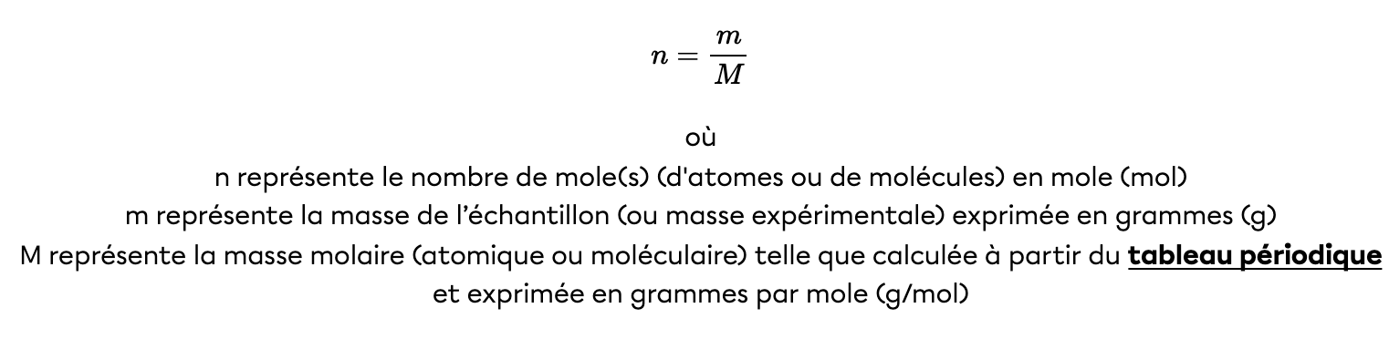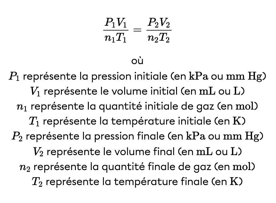Aussi, bien que je t’aie orienté vers la formule de la loi générale des gaz, n’oublie pas d’utiliser la formule de la masse molaire qui va comme suit :