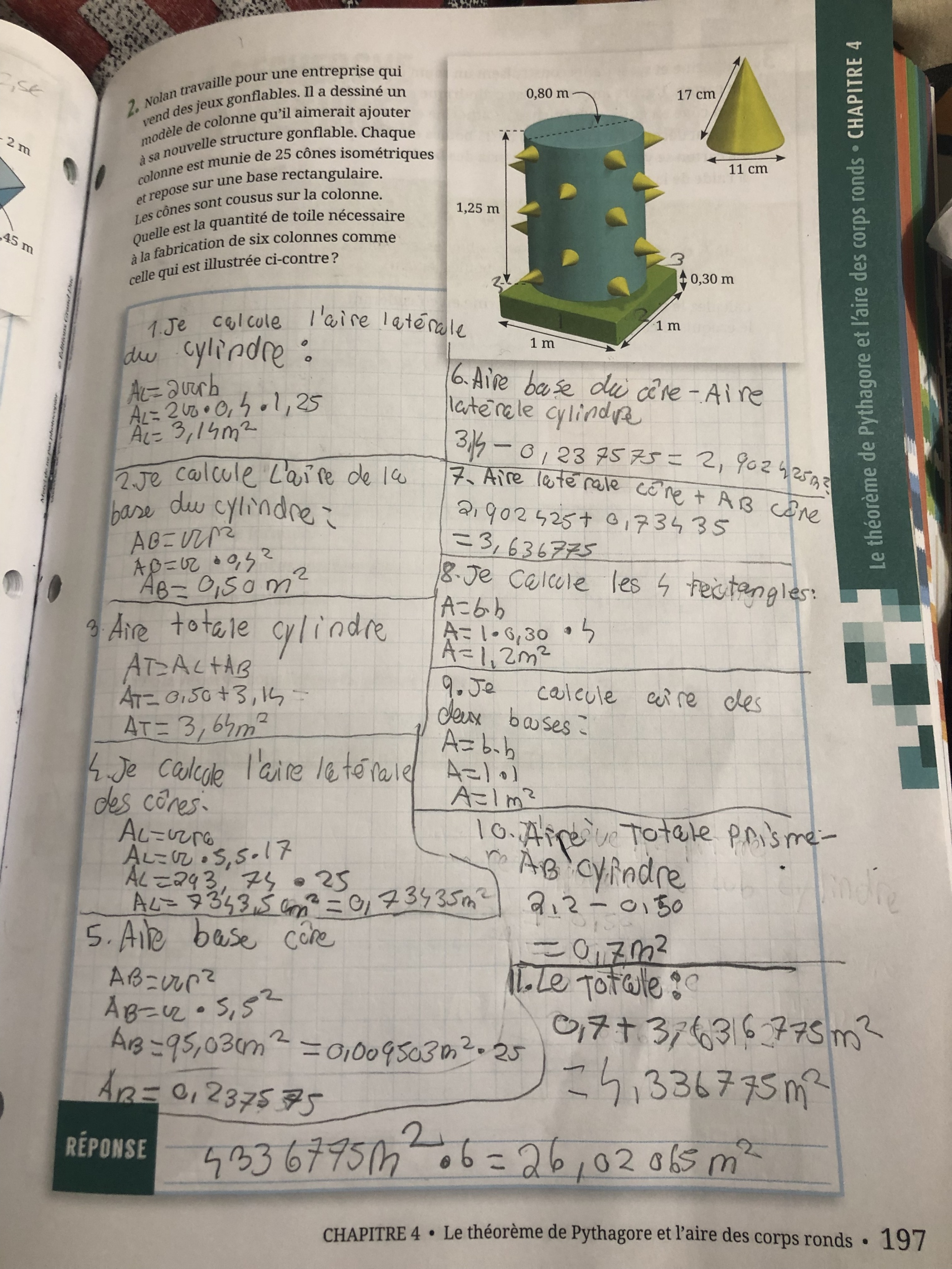 À l'étape 7, tu calcules plutôt la somme de l'aire latérale du cylindre et l'aire latérale des cônes.