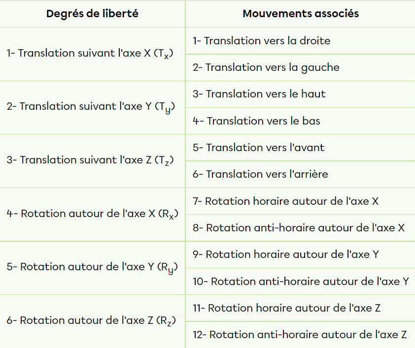 Les degrés de liberté sont divisés en deux catégories, la rotation et la translation. Ces deux types de mouvement peuvent s'effectuer selon les axes x, y et z, comme tu peux le voir dans le tableau. Également, chaque degré de liberté donne deux mouvements, par exemple il est possible de faire une translation ou une rotation dans deux directions. Que ce soit de vers l'avant ou l'arrière, une rotation horaire ou antihoraire.