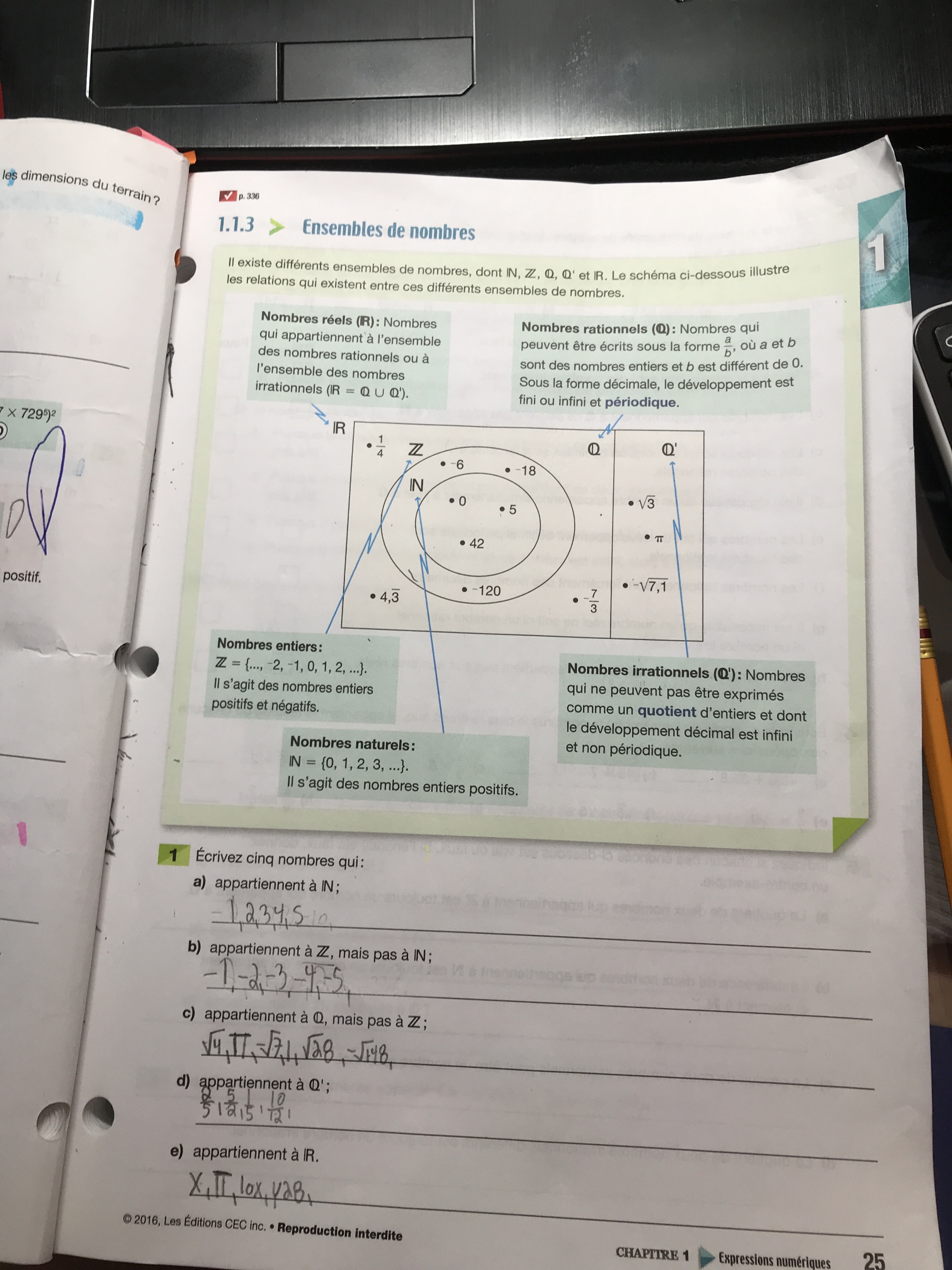 Je pense que tu as inversé tes réponses par accident pour le numéro c et d). Les nombres que tu as mis au d) ont un développement décimal fini, ils appartiennent donc à Q, et non Q', et ceux que tu as mis au c) ont un développement infini non périodique, ils appartiennent donc à Q'.
