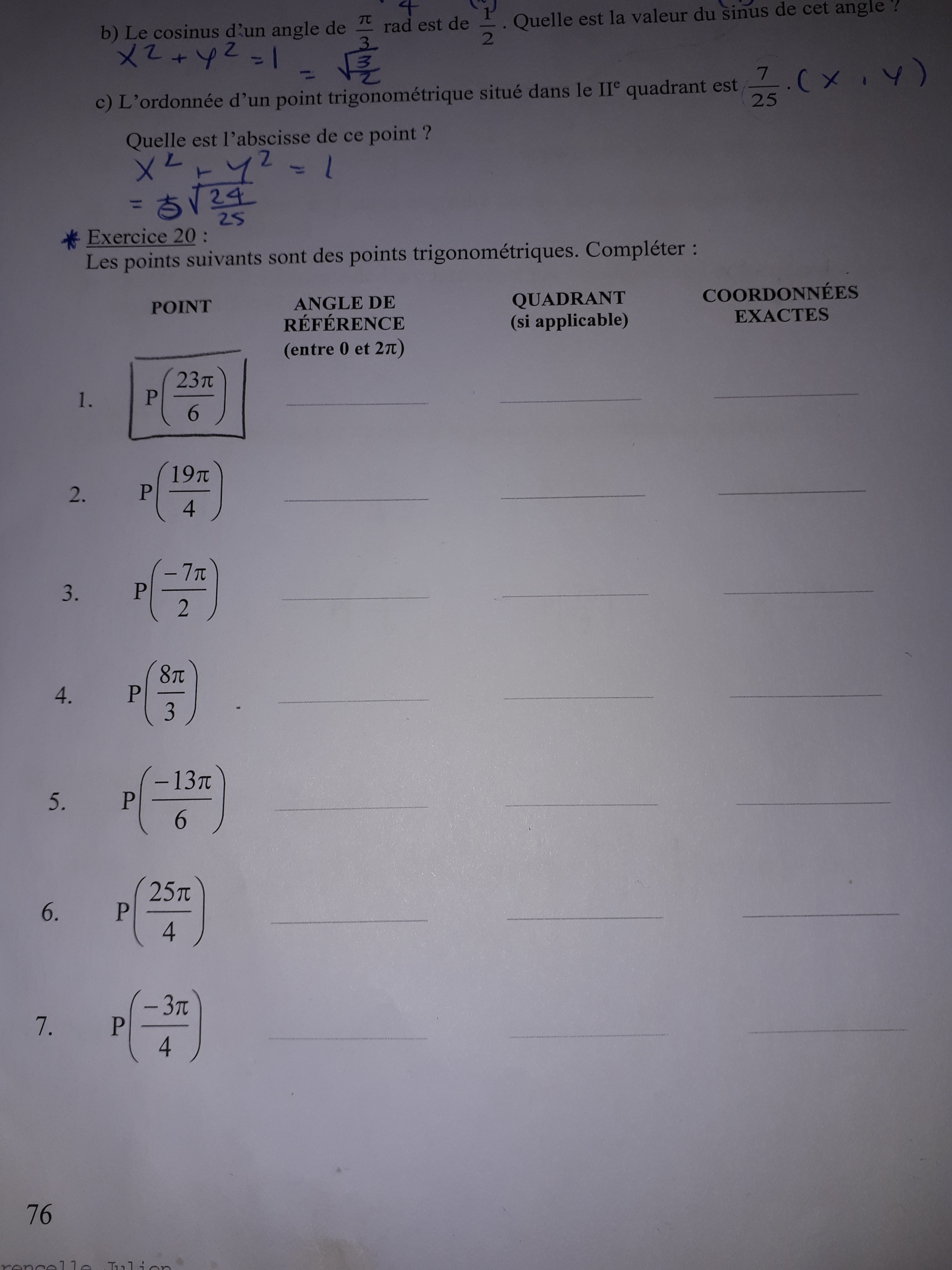 Par exemple, pour le numéro 1 de l'exercice 20, l'angle 23π/6 équivaut à un angle dans l'intervalle [0, 2π]. Comme tu le sais sûrement, pour effectuer une soustraction, il est préférable que les dénominateurs soient les mêmes. Dans ton cas, tu pourrais commencer par soustraire 2π à 23π/6, soit 23π/6 - 12π/6...