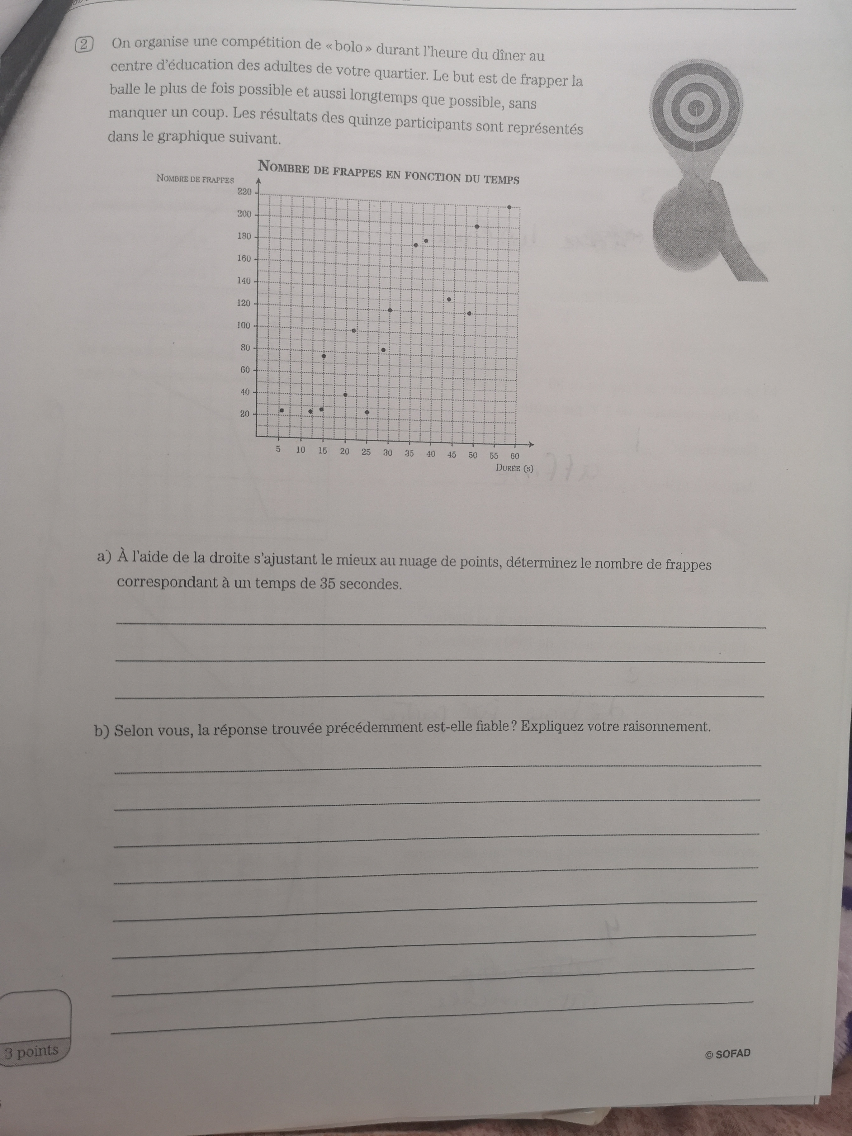 Lorsque la droite et sa règle auront été déterminées, il suffira de remplacer la variable du temps par 35 secondes pour trouver le nombre de frappes correspondant.