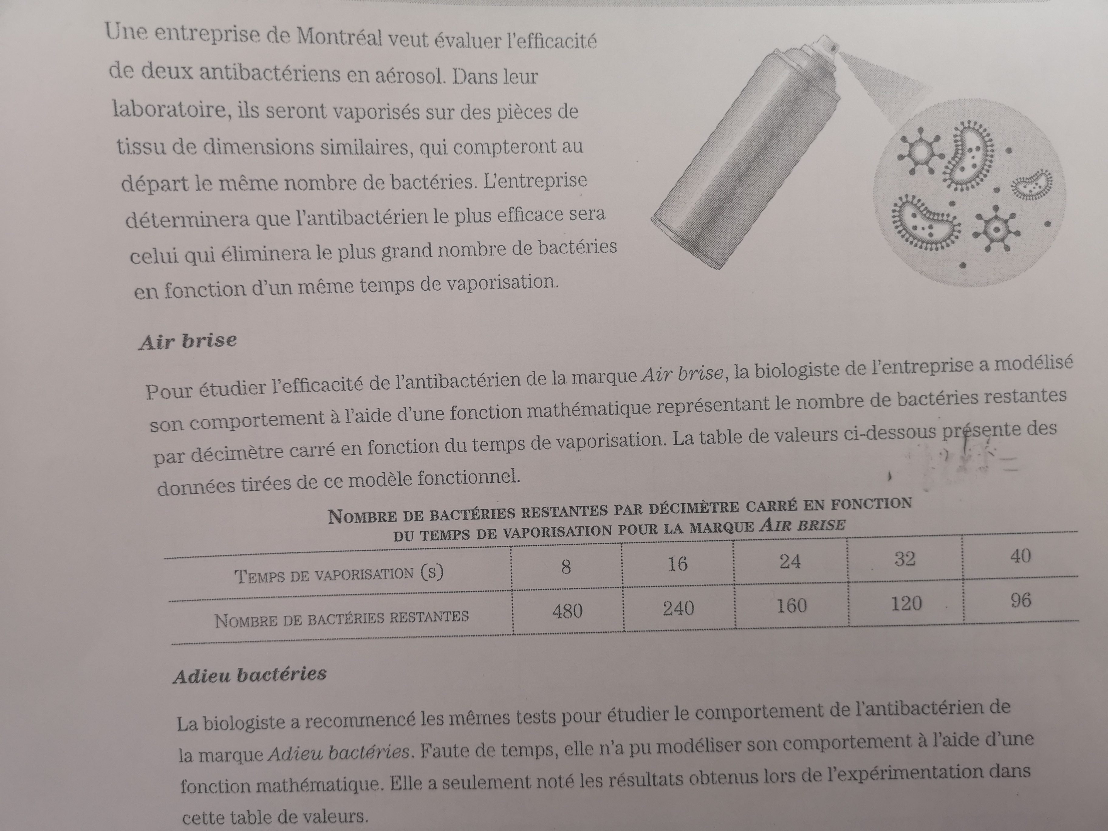 Ainsi, nous devons trouver la valeur de la constante qui est divisée par x. Le truc pour trouver cette valeur est de prendre un point et le remplacer dans la fonction. Je te laisse essayer! La variable x est le temps et la variable y est le nombre de bactéries.