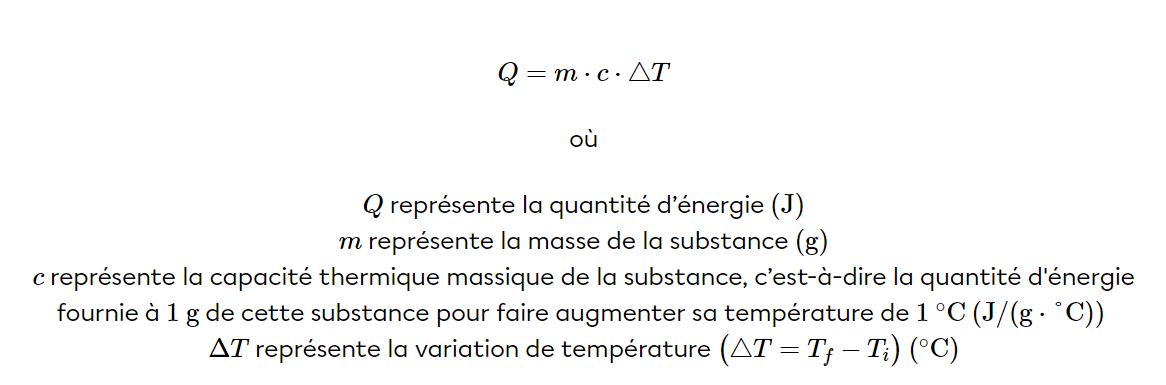 La nature du liquide détermine la valeur de c, il s'agit d'une valeur propre à chaque liquide. Ainsi, cette valeur dicte la quantité d'énergie qu'il faut apporter à la substance pour la faire monter de 1°C.