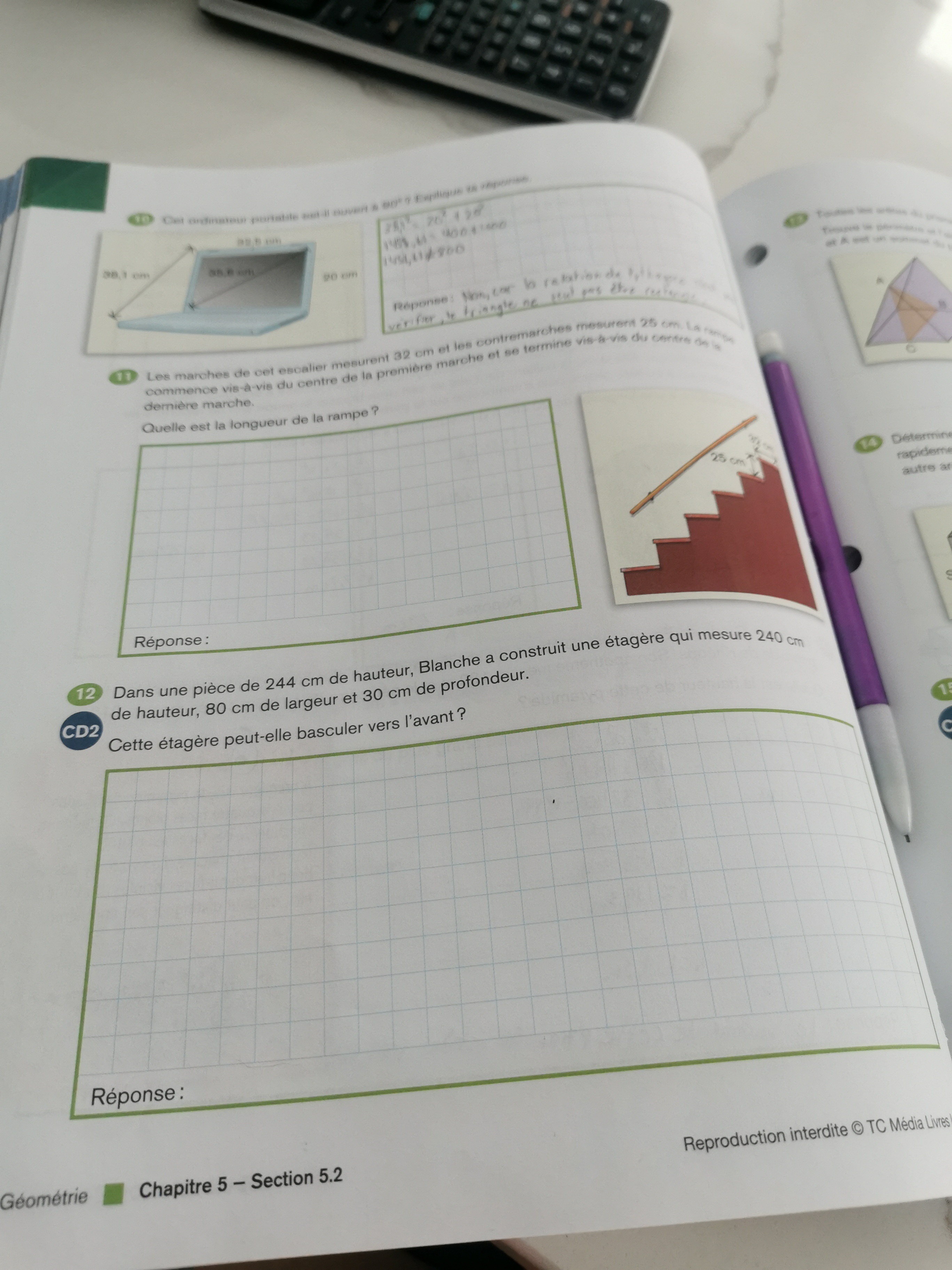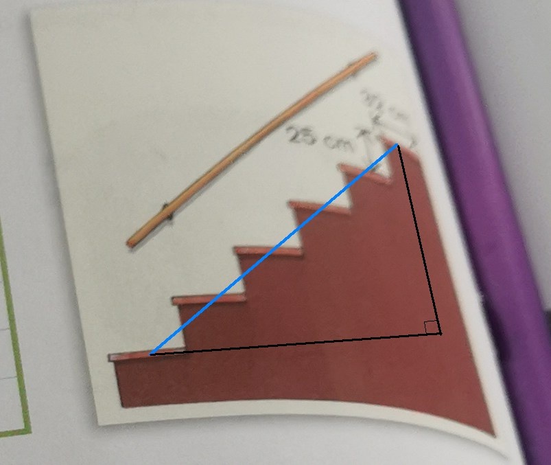 #11 ; tu dois trouver la longueur de la rampe, tu as une composante en x (la marche, 32 cm) et une composante en y (la contremarche, 25 cm). Voici ici un schéma