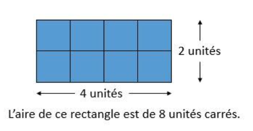 Donc, tel que le schéma le démontre, nous voyons que l’aire est égale à 2 unités X 4 unités ce qui fait 8 unités carrées. En d’autres mots, le schéma démontre qu’il y 8 carrées d’une unité par unité qui entre dans le rectangle bleu.