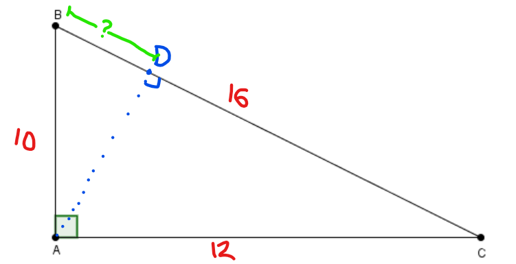 un triangle rectangle ABC, BC l'Hypothénuse 16cm, BA: 10 cm et AC 12 cm. Il y a un poit D sur le coté de l'hypothénuse. Quelle sera la longueur de BD, car il faut calculer la hauteur AD
