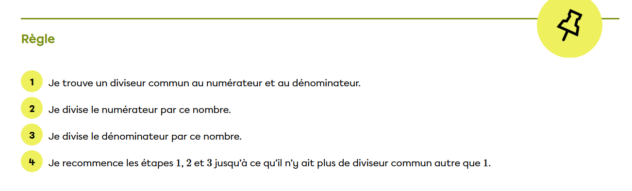 Voici un article d'Alloprof qui pourrait t'aider: https://www.alloprof.qc.ca/fr/eleves/bv/mathematiques/les-fractions-equivalentes-et-la-reduction-m1031