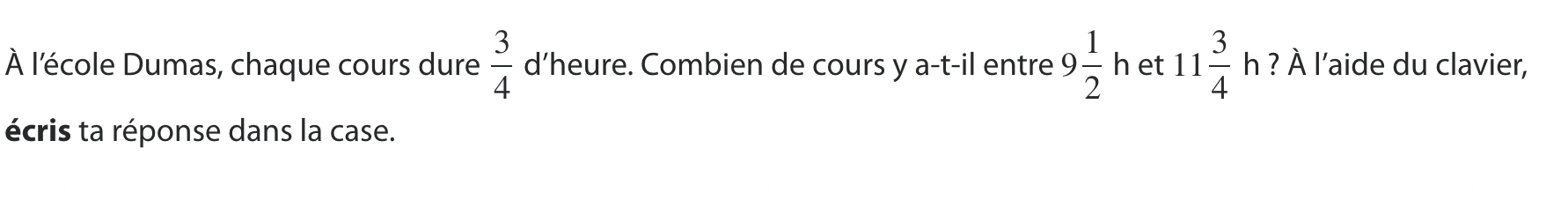 Ensuite, il faudrait soustraire ce que 9 heures et 1/2 t'aurais donné de ce que 11 et 3/4 t'aurais donné, puis diviser cela par la durée d'un cours. Si jamais ça te donne un nombre à virgule, tu ignores la partie décimale (dans ce cas ci, certains autres problèmes voudraient que tu gardes la partie décimale ou que tu l'arrondis)