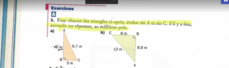 Prenons le cas du sin(A) pour le a). Selon la définition du rapport sinusoïdal :