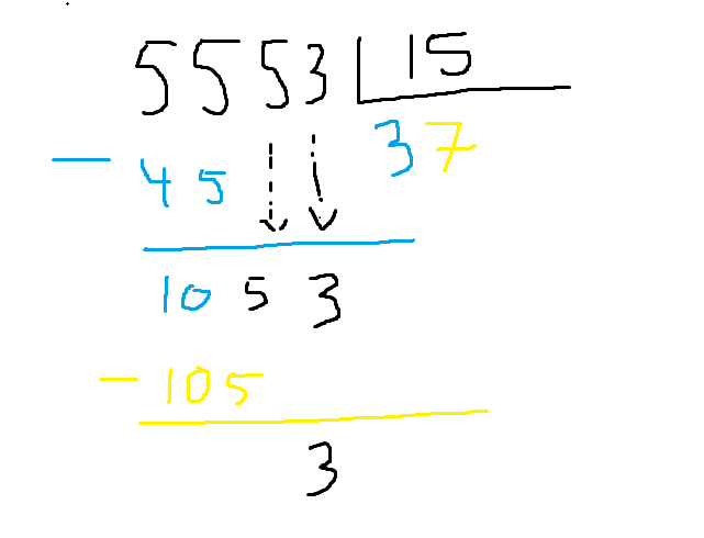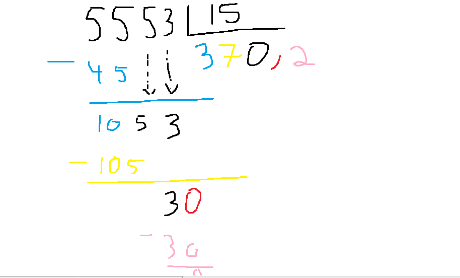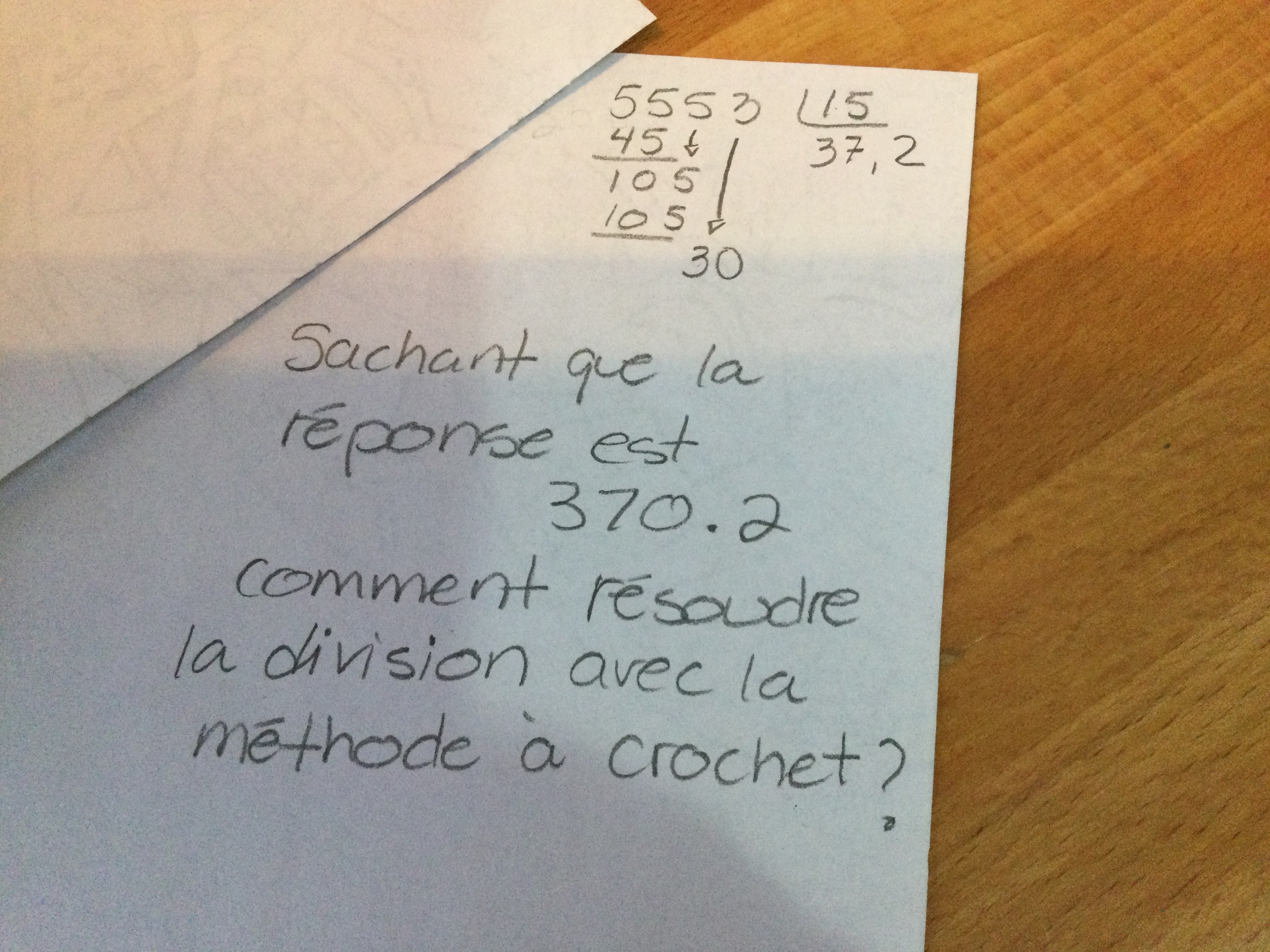 Je repose ma question qui semble ne pas être claire: je n’arrive pas à diviser 5553 par 15 en utilisant la méthode du crochet. Je vous joins ce que j’ai essayé mais j’arrive à 37,2 alors que la réponse doit être 370,2