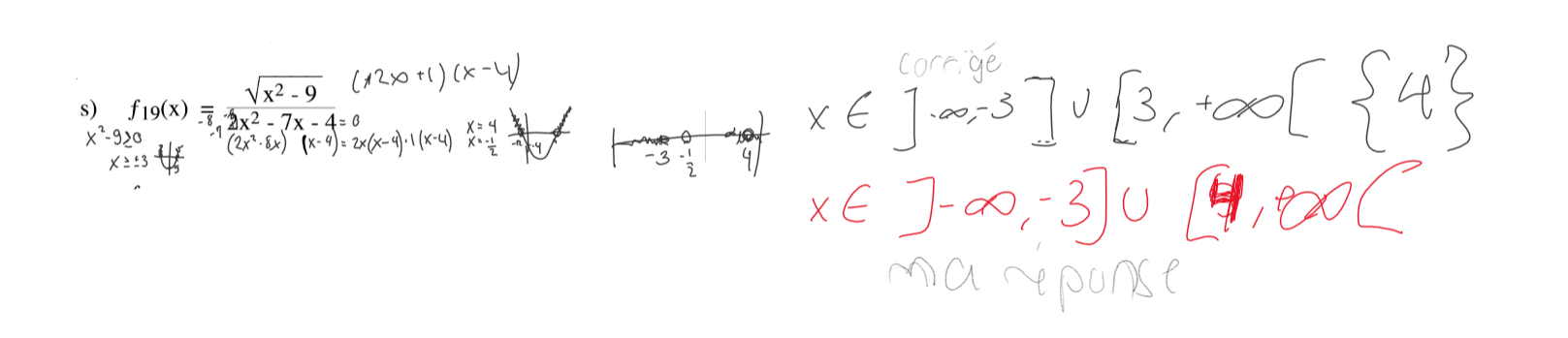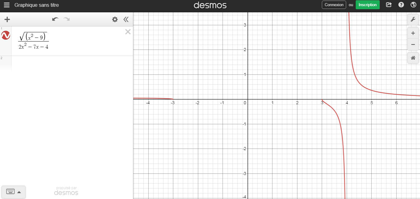 Il ne faut pas que \(2x^2-7x-4=0\) → \(x\neq\tfrac{-1}{2}\) et \(x\neq4\).