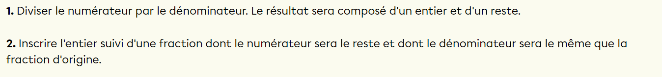En d'autres mots, tu dois soustraire le dénominateur du numérateur autant de fois que tu le peux, tu enlèveras ainsi les entiers de ce numérateur.