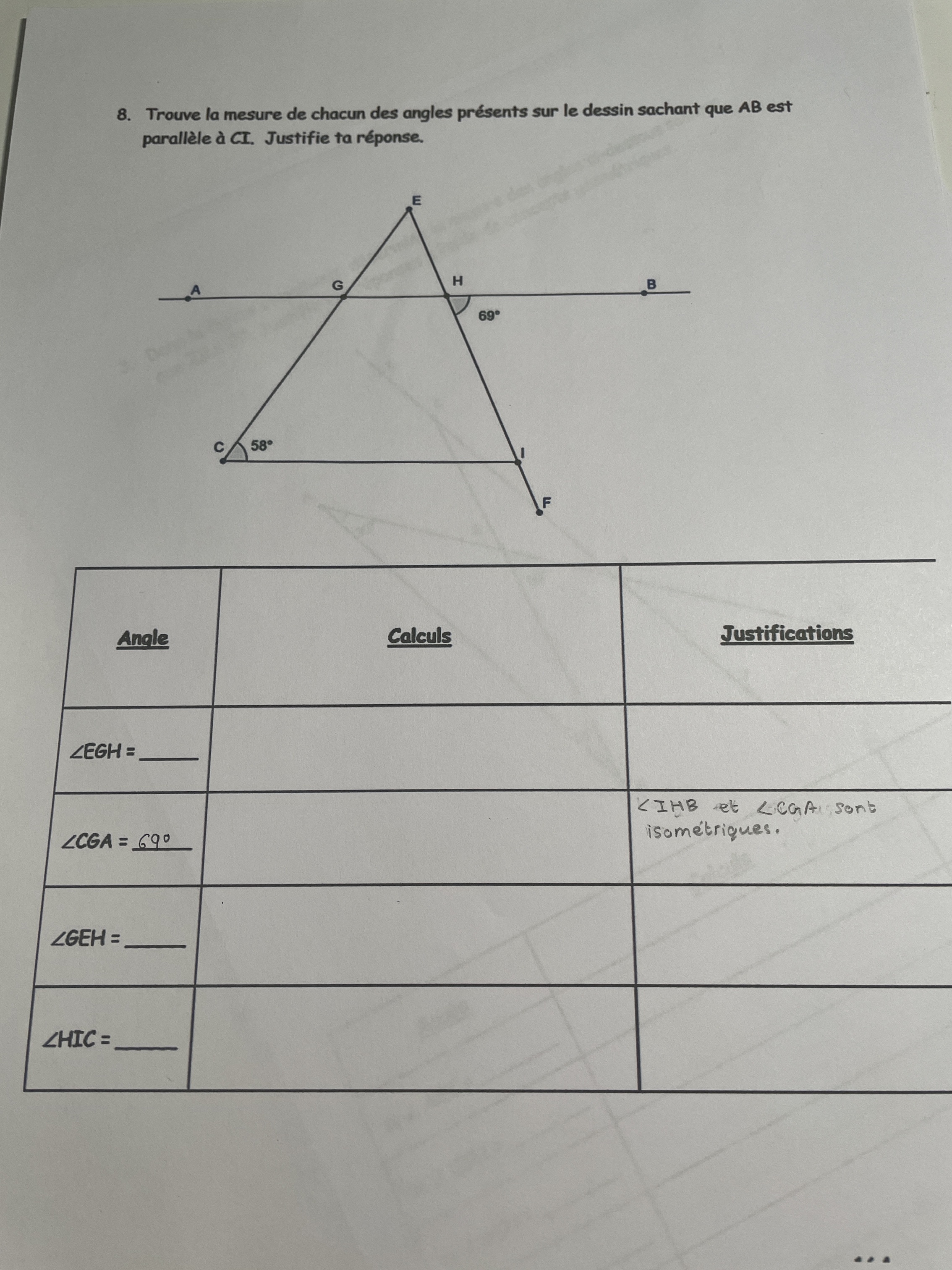 Donc pour ce numéro tu va utiliser t'est alterne-interne et t'est angles donner. Ensuite tu va utiliser les lettres donner dans le tableau et les trouvées sur le dessins et engros expliquer comment elle sont par exemple: Angle EGH est un alterne-Externe avec l'angle BHI.