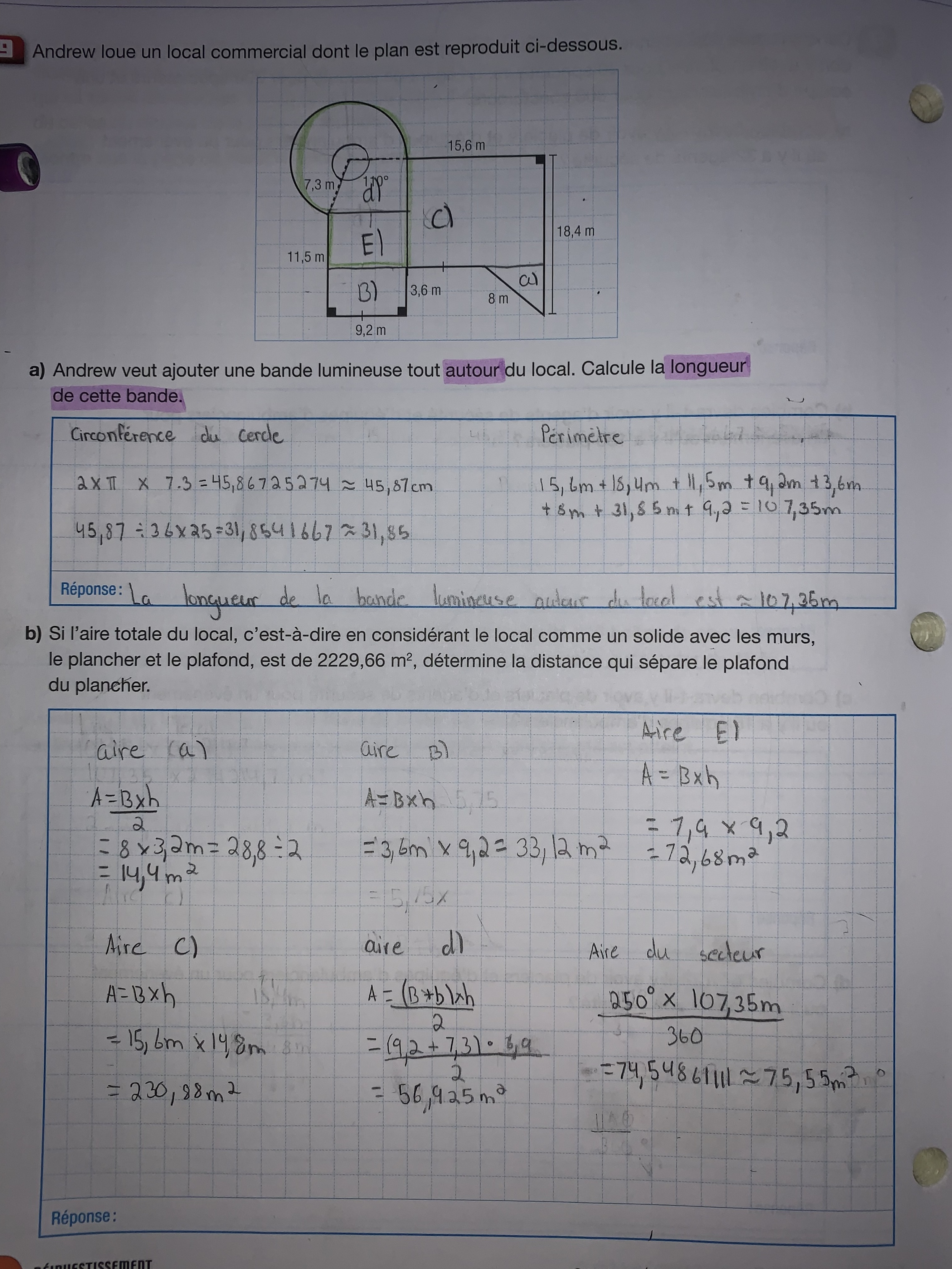 En additionnant les aires que tu as trouvées, tu pourras calculer l'aire de la base (au b). Ensuite, en faisant Al + 2Ab = At, Périmètre de la base (que tu as déjà trouvée à l'exercice a) x hauteur (que tu cherches) + 2 Aire de la base (que tu auras calculée au b) = 2229,66 m carrés, tu pourras isoler la valeur de la hauteur (h).