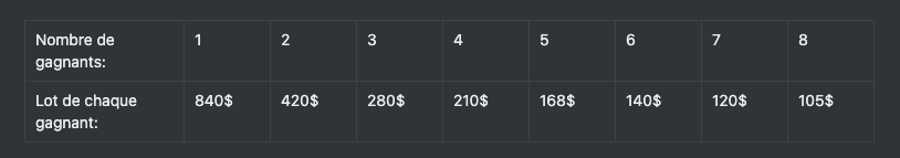 Pour trouver le lot de chaque gagnant, il suffit juste de diviser 840$ par le nombre de gagnants.