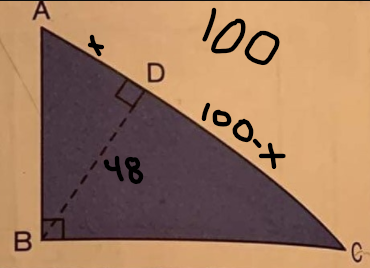 Pour compléter les explications de LokoriIota1779 et d'AvocatTenace5359, dans cet exercice, on peut repérer 3 triangles semblables, soit le triangle ABC, ABD et DBC. De plus, on peut identifier la mesure du segment AD par x, et déduire que la mesure de DC est de 100-x, comme ceci :