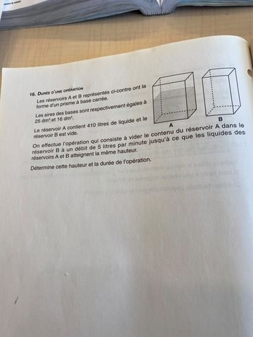 Pour compléter la réponse fournie par Loutre Philosophe, lorsque la valeur de x est déterminée, tu peux utiliser l'une des deux équations de la hauteur, comme la hauteur est la même dans les deux prismes, et y remplacer la variable x par sa valeur! Il te sera donc possible de déterminer la hauteur de l'eau dans les deux prismes.