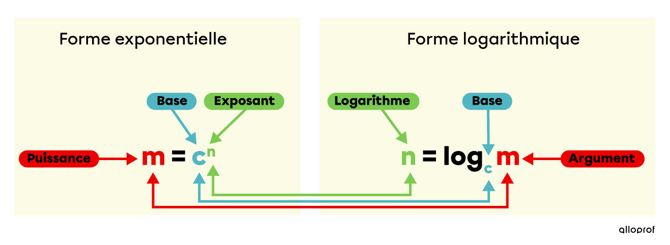 Un logarithme peut s'écrire sous forme d'exposant, et vice-versa :