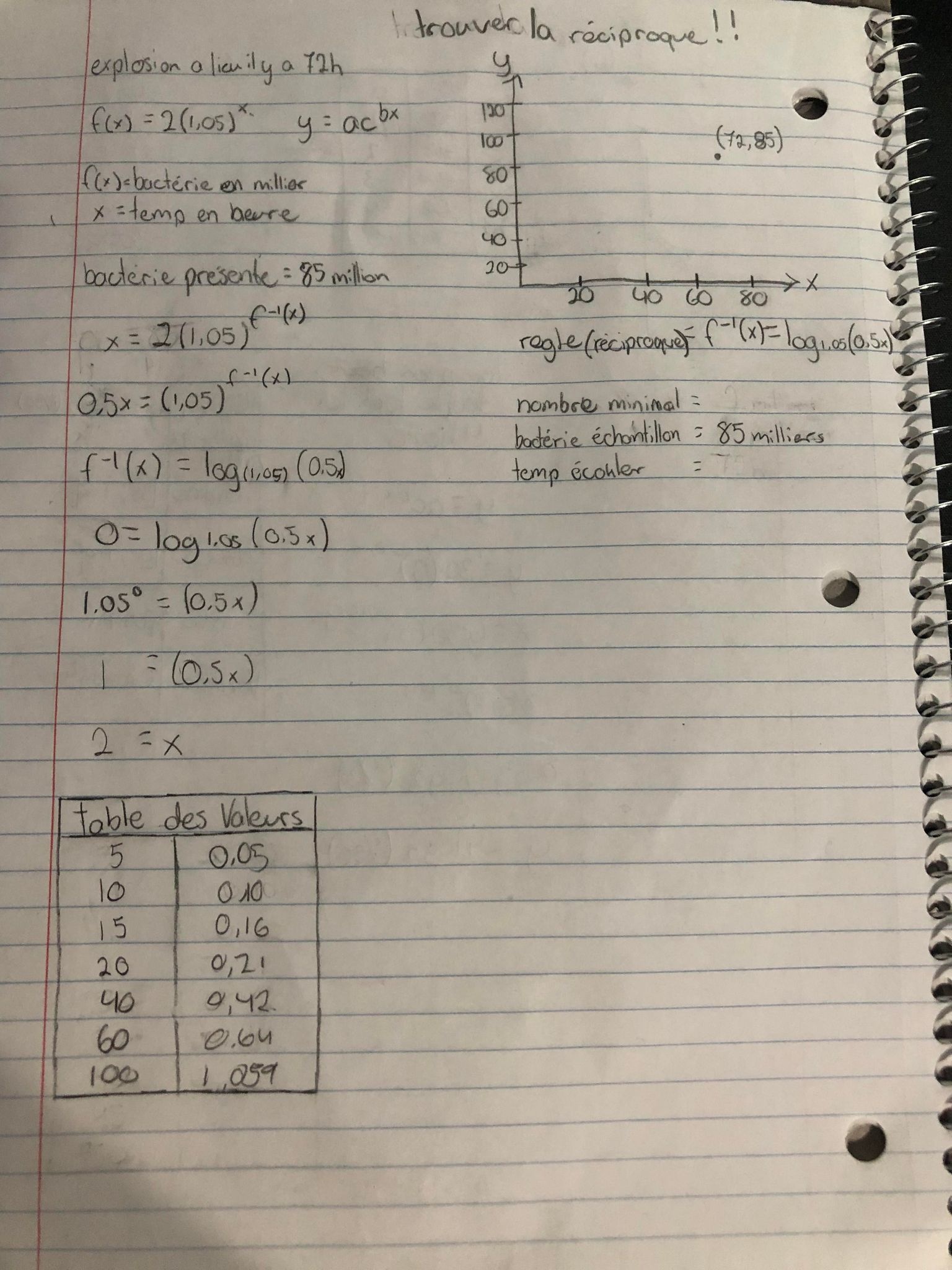 Bonjour je suis présentement entrain de faire des mathématique TS 4 j'essaye de faire la table de valeurs de la fonction suivante f-1(x) = log1.05(0.5x) mais peut importe la valeurs que je met dans X je reçois un un chiffre de 0 a 1 pourtant je sais dans mon problème que si x = 72 y est sensé égaler 85 et non 0.76