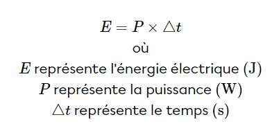 Ainsi, on obtient sa valeur en multipliant la puissance du système par l'intervalle de temps que l'on cherche à évaluer. C'est très logique puisque la puissance est un débit d'énergie, les watts sont des joules en fonction de seconde. Alors, si on multiplie un intervalle de temps à seconde à la puissance, nous retrouvons une quantité de joules, c'est-à-dire de l'énergie.