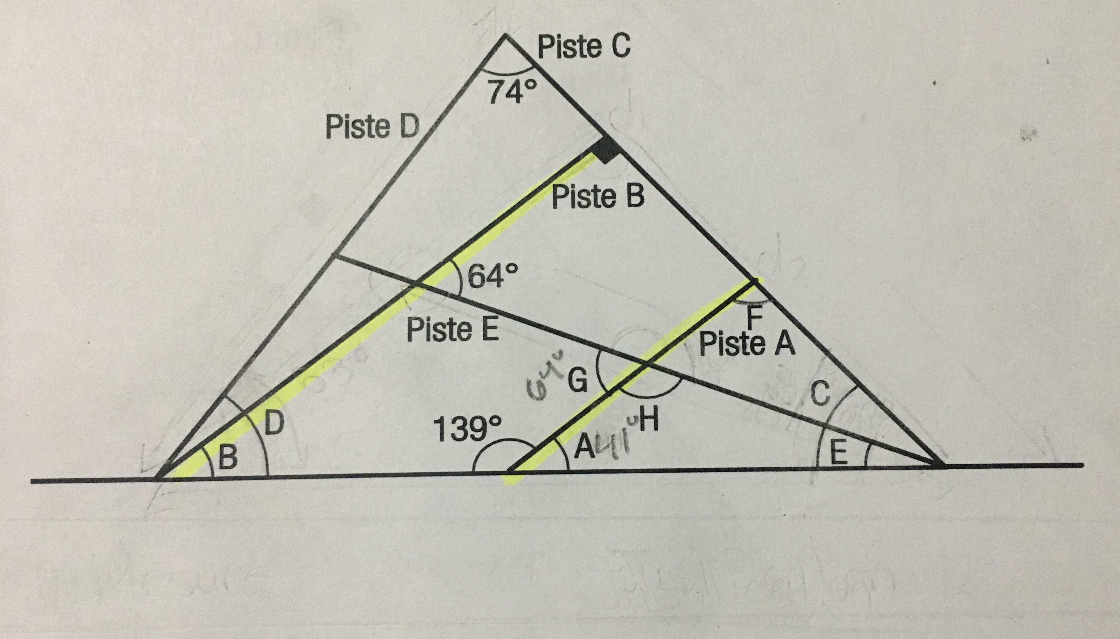 je n’arrive pas à trouver les autres angles. Les pistes A est B sont parallèles. Les fiches d’alloprof sur la relations des angles m’aide pas :(