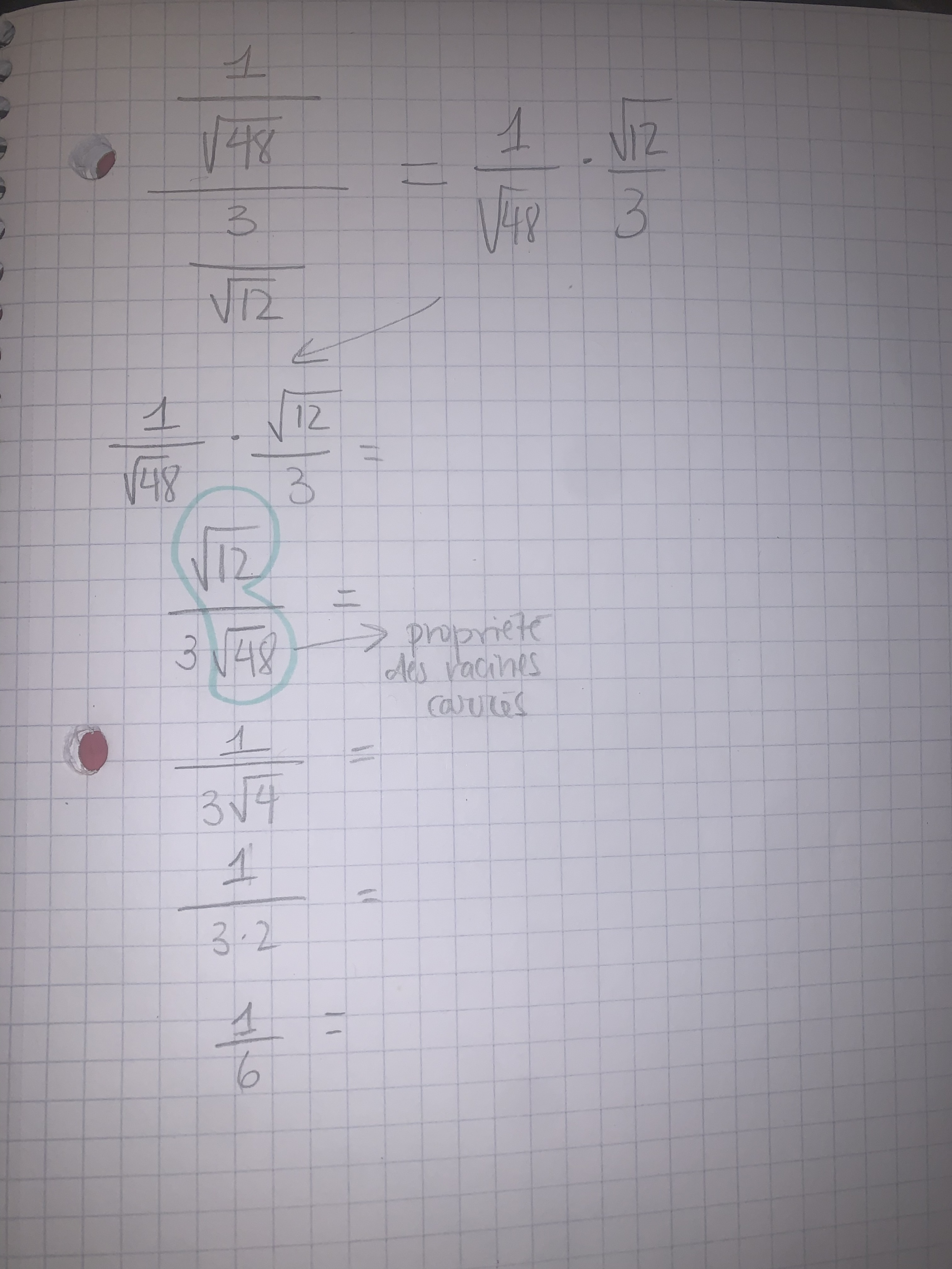 Oublie pas qu'une division de fraction c'est comme multiplié ces fractions, mais en inversant les numérateurs et les dénominateurs. Pour ton cas, (1/√48) / (3/√12) revient à faire