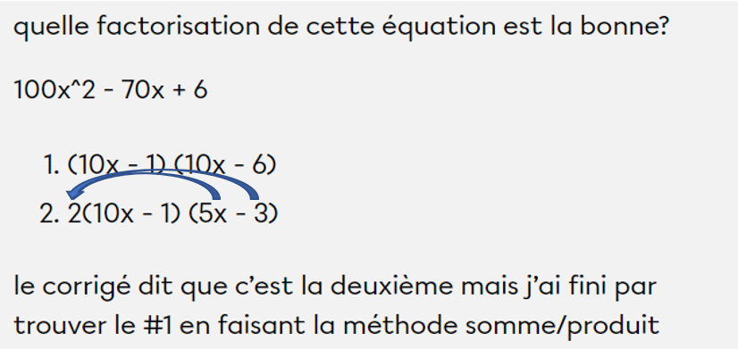 le corrigé dit que c’est la deuxième mais j’ai fini par trouver le #1 en faisant la méthode somme/produit