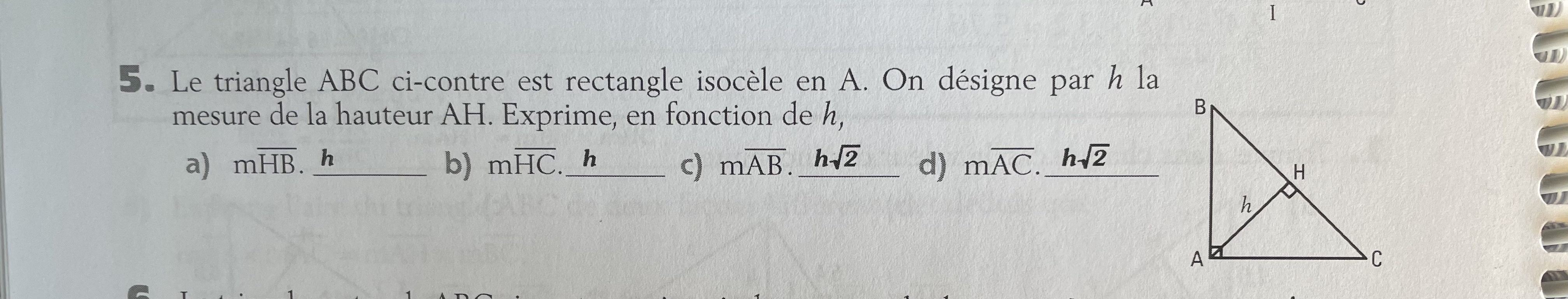Parce que le triangle est rectangle isocèle en A ça veut dire que l'angle en B et l'angle en C sont de 45 deg (la somme des angles d'un triangle étant 180 deg). Et comme l'angle en H (pour la hauteur) est de 90 deg tous les angles qui ne sont pas de 90 deg sont de 45 deg ce qui fait que les triangles BHA et AHC sont isocèles en H.