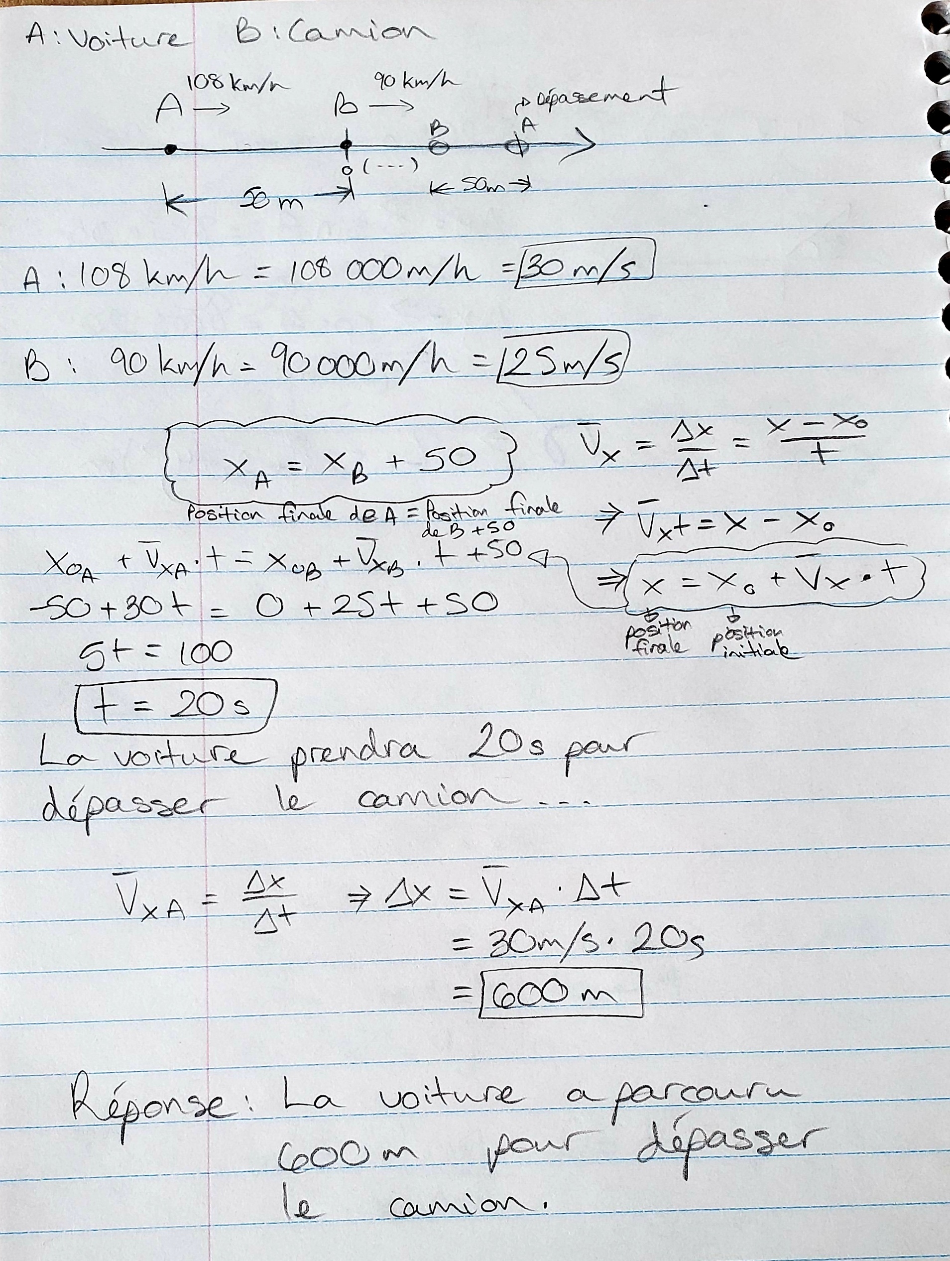 Toutefois, ce n'est pas ce qui t'es demandé dans la question : on cherche plutôt la distance nécessaire pour que la voiture dépasse le camion d'un 50 mètres supplémentaire, ce qui requiert le double du temps trouvé précédemment, compte tenu du fait que la vitesse est constante.