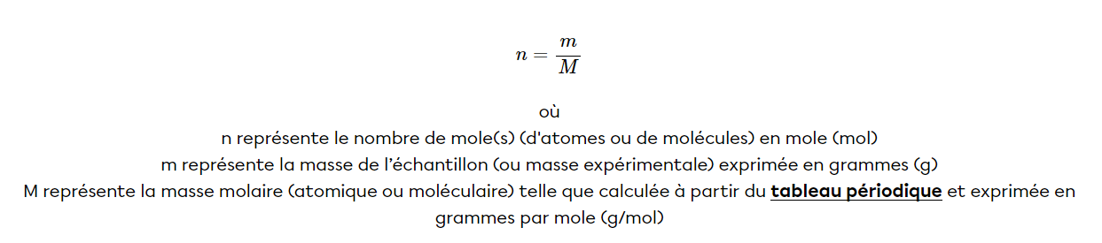Maintenant, il faut trouver le nombre total de moles dans 10g de Al2O3. Pour ce faire, il faut trouver la masse molaire de la molécule. Pour trouver cette valeur, il faut additionner la masse molaire de chaque atome de la molécule, on retrouve ces masses dans le tableau périodique. Une fois cette valeur trouvée, tu peux utiliser la formule suivante: