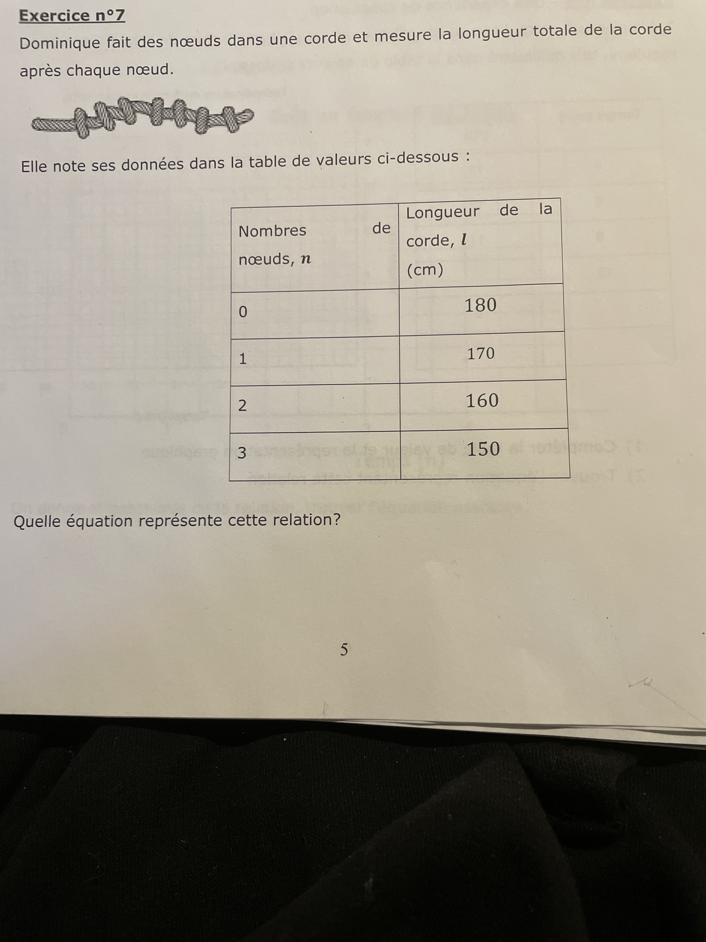 On constate par la suite que chaque nœud soustrait 10 cm à la longueur totale de la corde. On peut traduire ceci par l'expression «-10n» (où -10 représente la longueur soustraite à chaque nœud et «n» le nombre de nœud). De plus, nous savons que la longueur de notre corde est de 180cm
