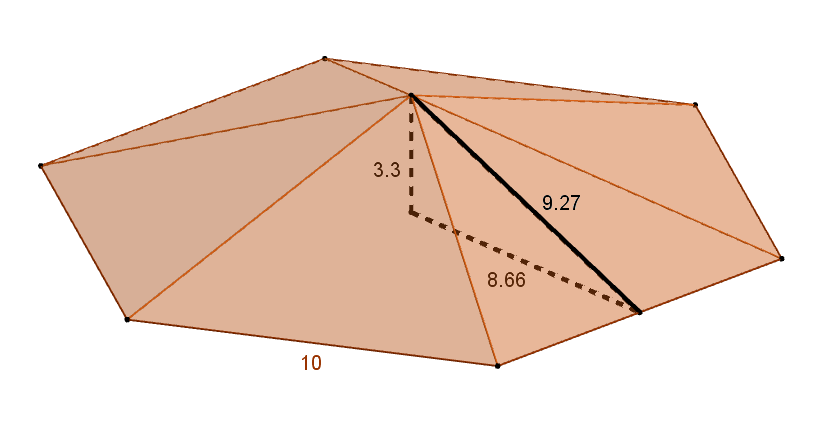 En effet, tu pourrais calculer le volume de ce solide en effectuant la somme des volumes des deux pyramides droites à base hexagonale (en haut et en bas) et du prisme droit à base hexagonale (au centre). Dans les deux calculs des volumes, tu dois connaître l'aire de l'hexagone (la base de la pyramide et la base du prisme).