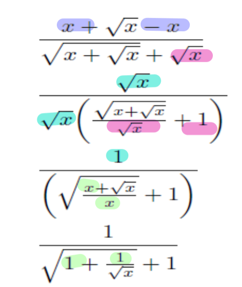 On force une mise en évidence simple en mettant racine de x au dénominateur. Le 1 apparait, car un nombre divisé par lui-même donne toujours 1.