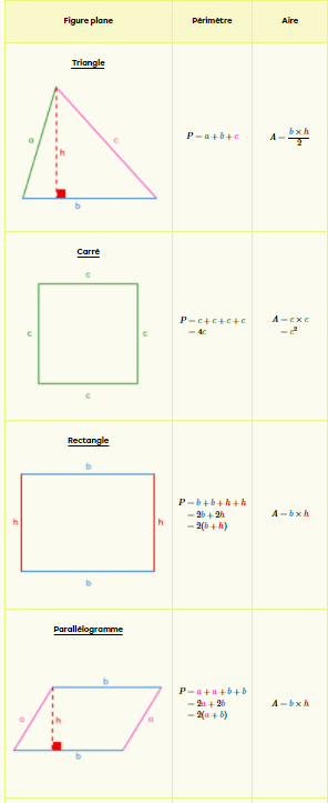 De plus, chaque forme possède sa propre formule permettant de calculer son aire, les voici :