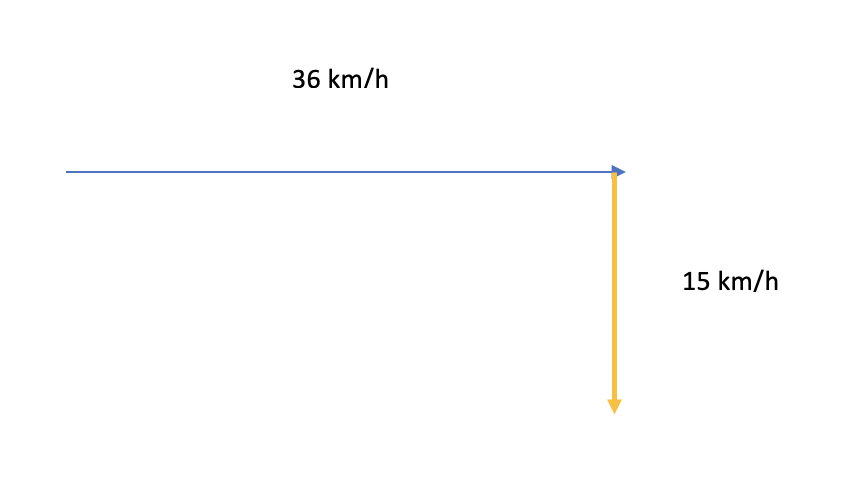 En a), il faut tenir compte de l'influence du vent sur le dirigeable. Ici, deux vitesses sont évaluées, soit celle du dirigeable de 36 km/h vers l'est et celle du vent de 15 km/h vers le sud. Il est donc possible de représenter graphiquement c'est deux vecteurs, comme ceci: