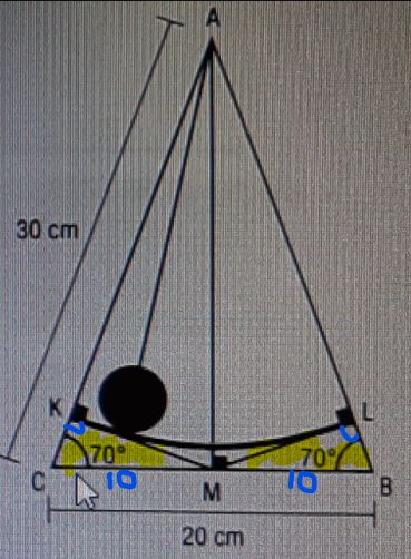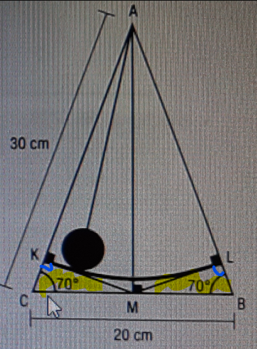 Note: dans le triangle rectangle ACM, l'angle C ne mesure pas exactement 70° puisque arcos(10/30)=70,528...°