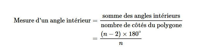 La deuxième façon est de se rappeler que la somme des mesures des angles d'un polygone à \(n\) côtés est \((n - 2) \cdot 180^{\circ}\). Si l'angle intérieur mesure 135° et qu'il y a \(n\) angles isométriques de cette mesure, alors la somme pour ce polygone est aussi \(135° \cdot n\). Tu peux donc résoudre l'équation \[(n -2) \cdot 180 = 135 n\] On obtient \[180n - 360 = 135n\] \[45n - 360 = 0\] \[45n = 360\] \[n = \frac{360}{45} = 8\]Il s'agit d'un octogone régulier.
