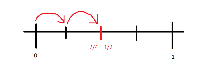 Maintenant, tu peux facilement placer la fraction sur la droite numérique. 2/4 revient à compter 2 bonds à partir de 0 :