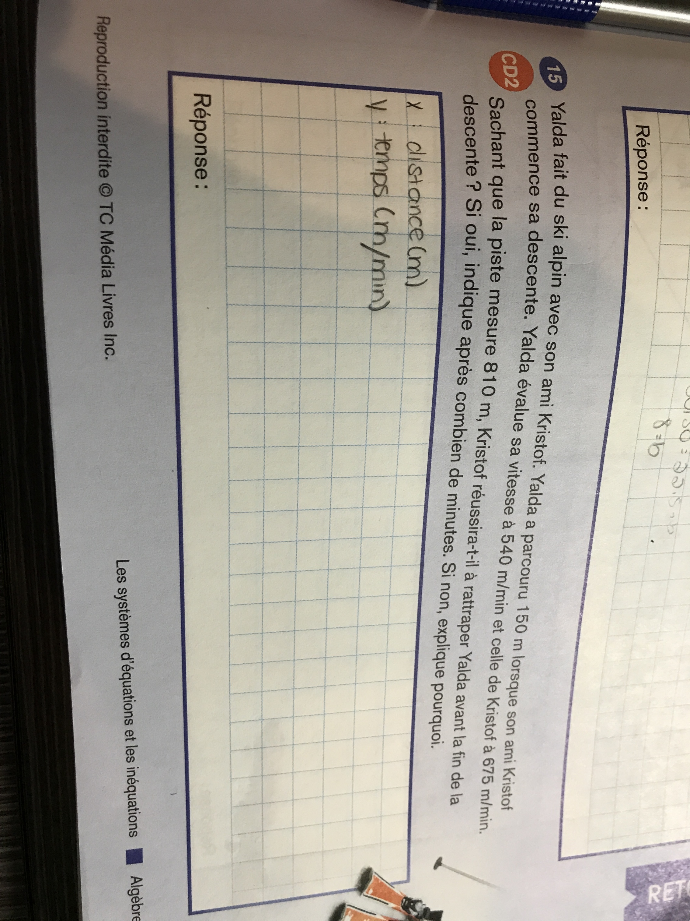 On sait que Yalda a déjà parcouru 150 m lorsque Kristof démarre. Donc, lorsque x=0, f(x)=150m. L'ordonnée à l'origine de la fonction représentant Yalda est donc 150. On a alors : y=ax+150 .