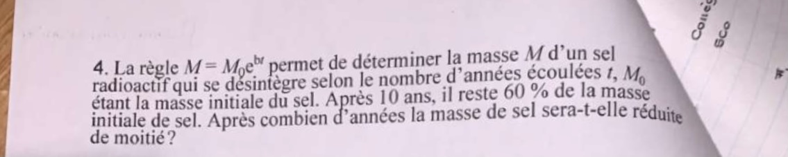 Puis, on cherche t lorsque la masse représente 50% de sa masse initial. On cherche donc la valeur de t dans (b a été trouvée précédemment) :