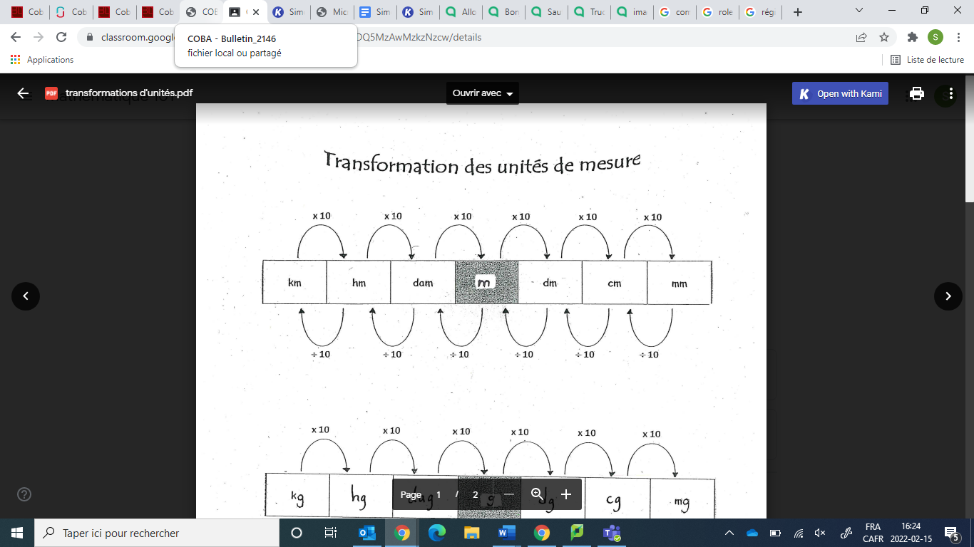 Premièrement, pour transformer une unité de mesure en une autre plus grande, c'est divisé par 10 pour chaque unité de plus