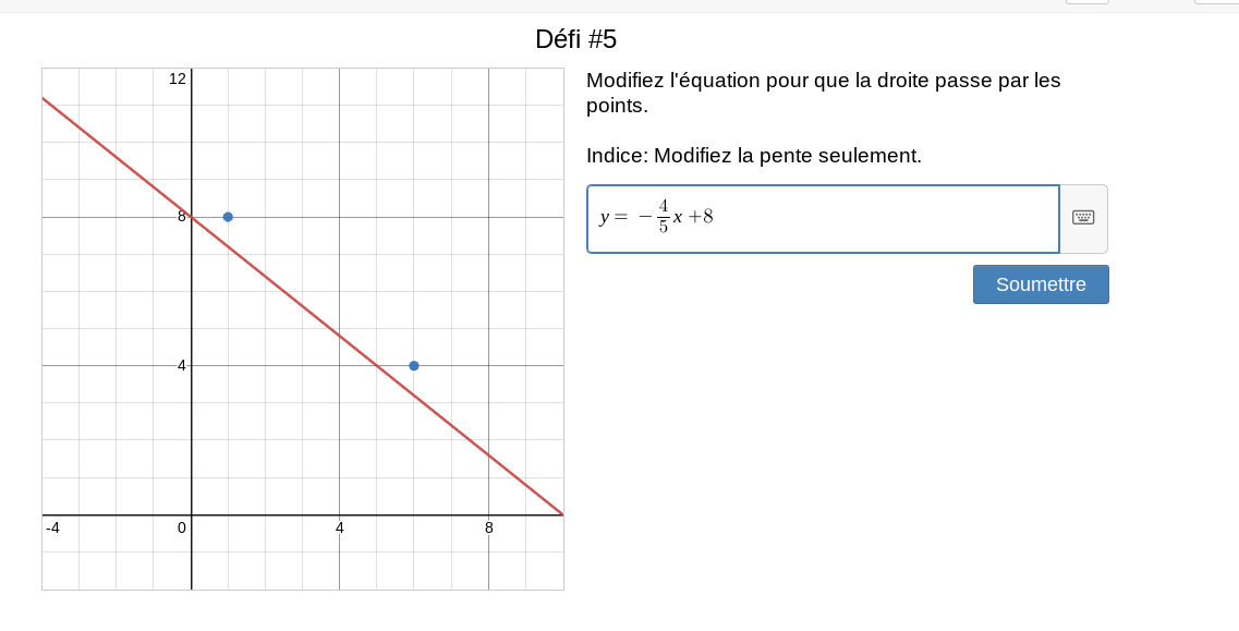 Tu as trouvé l'équation de la droite rouge déjà dessinée, mais on te demande plutôt de trouver celle de la droite qui passerait par les deux points bleus. Puisqu'on te dit de modifier seulement la pente, tu dois donc trouver la pente qui fait en sorte que l'on passera par les points (1,8) et (6,4). Pour trouver la pente d'une droite qui passe par 2 points connus, on utilise la formule suivante :