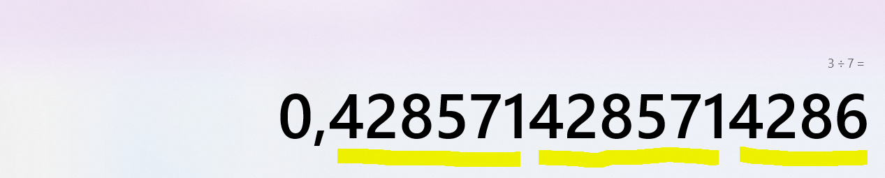 Tout d'abord, la fraction 3/7 exprimée en nombre décimal est un nombre périodique (qui se répète à l'infini). Dans le cas de la fraction 3/7, la période après le zéro est 0,428571.