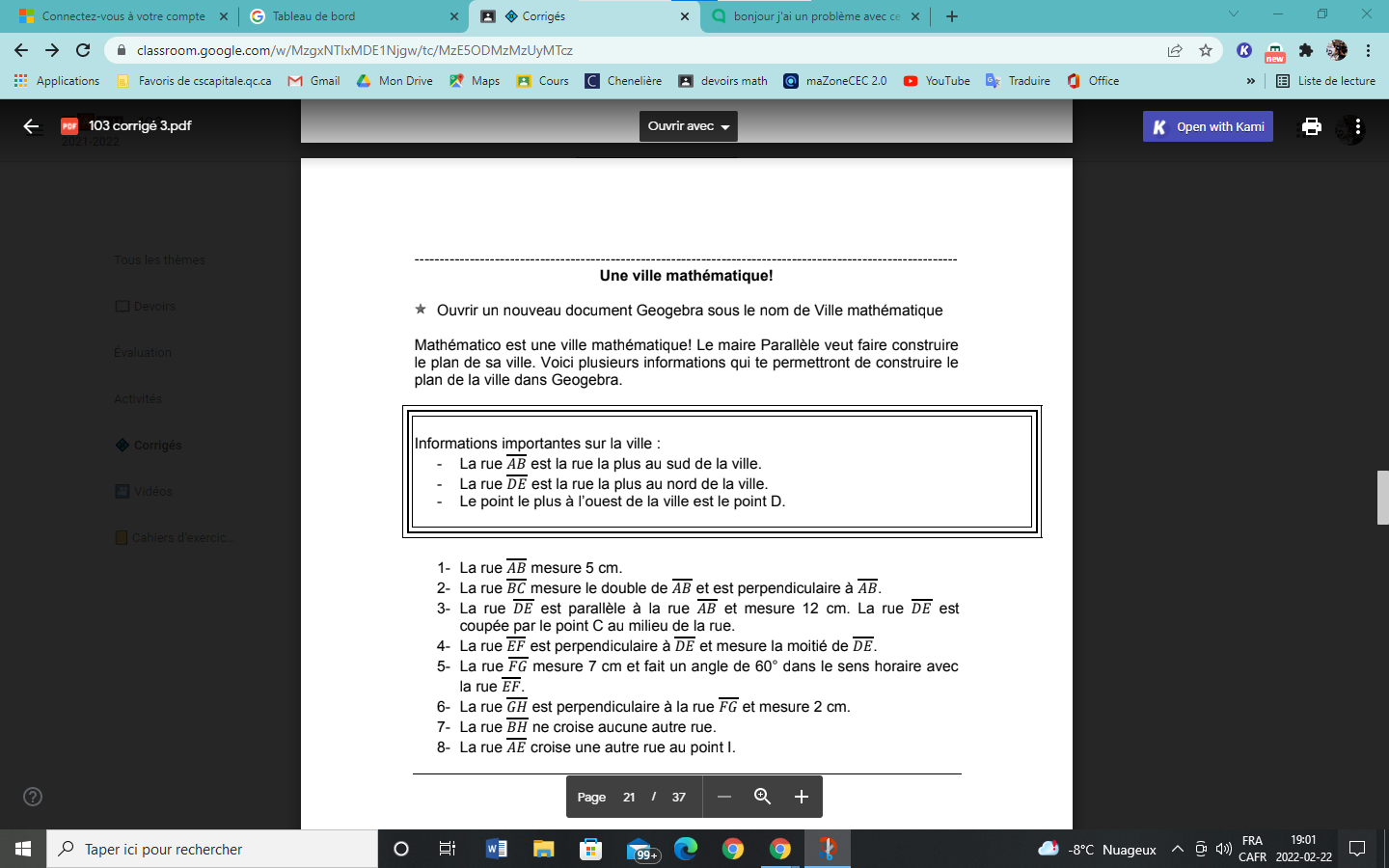 BC mesure le double de AB et est perpendiculaire à AB: alors ton segment BC part du point B sur la rue AB, il est perpendiculaire mais comme AB est la rue la plus au sud, ton segment sera donc perpendiculaire du côté Nord et il a le double de la longueur de AB