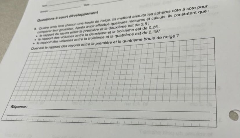 On te donne plusieurs ratios qui vont te permettre de déterminer le rayon de la première sphère par rapport au rayon de la dernière.