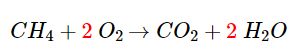 Dans cette réaction, le CH4 et le CO2 ont des coefficients de 1 et le O2 et le H2O ont des coefficients de 2. Ainsi, dans cette réaction, une mole de CH4 donne 1 mole de CO2 et 2 moles de H2O.